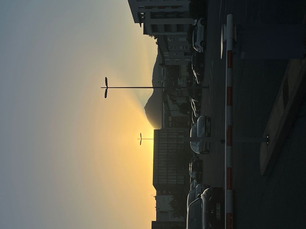 La montagne et son ombre : le Soleil bas sur l’horizon éclaire le sommet du Puy-de-Dôme et l’ombre de la cime se projette sur le ciel.